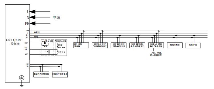 GST-QKP01火災報警控制器、氣體滅火控制器(簡稱為GST-QKP01)是海灣公司為適應工程設計的需要而開發(fā)的。GST-QKP01為典型的氣體滅火控制裝置,可配接感煙/感溫/火焰探測器、手動報警按鈕、緊急啟/停按鈕、聲光警報器、氣體噴灑指示燈、手自動轉換開關以及輸出模塊等,具有火災探測和氣體滅火控制功能,可實現1個防火區(qū)的火災報警和氣體滅火控制。GST-QKP01滿足GB 4717-2005 《火災報警控制器》和GB 16806-2006《消防聯動控制器》中有關氣體滅火控制器的要求,為室內使用設備。